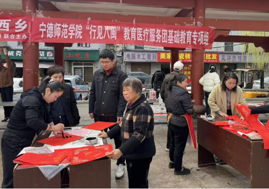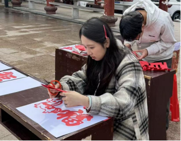 活动中,师生们在洋中镇好西乡广场现场书写春联和“福”字,并组织剪纸互动,累计送出200余件作品,为当地群众送上新春祝福与文化暖意。随后,团队前往东山村半山仙居等乡村振兴示范点,调研文旅融合、乡村风貌提升及文化IP打造情况,探索美育助力乡村振兴的有效路径。